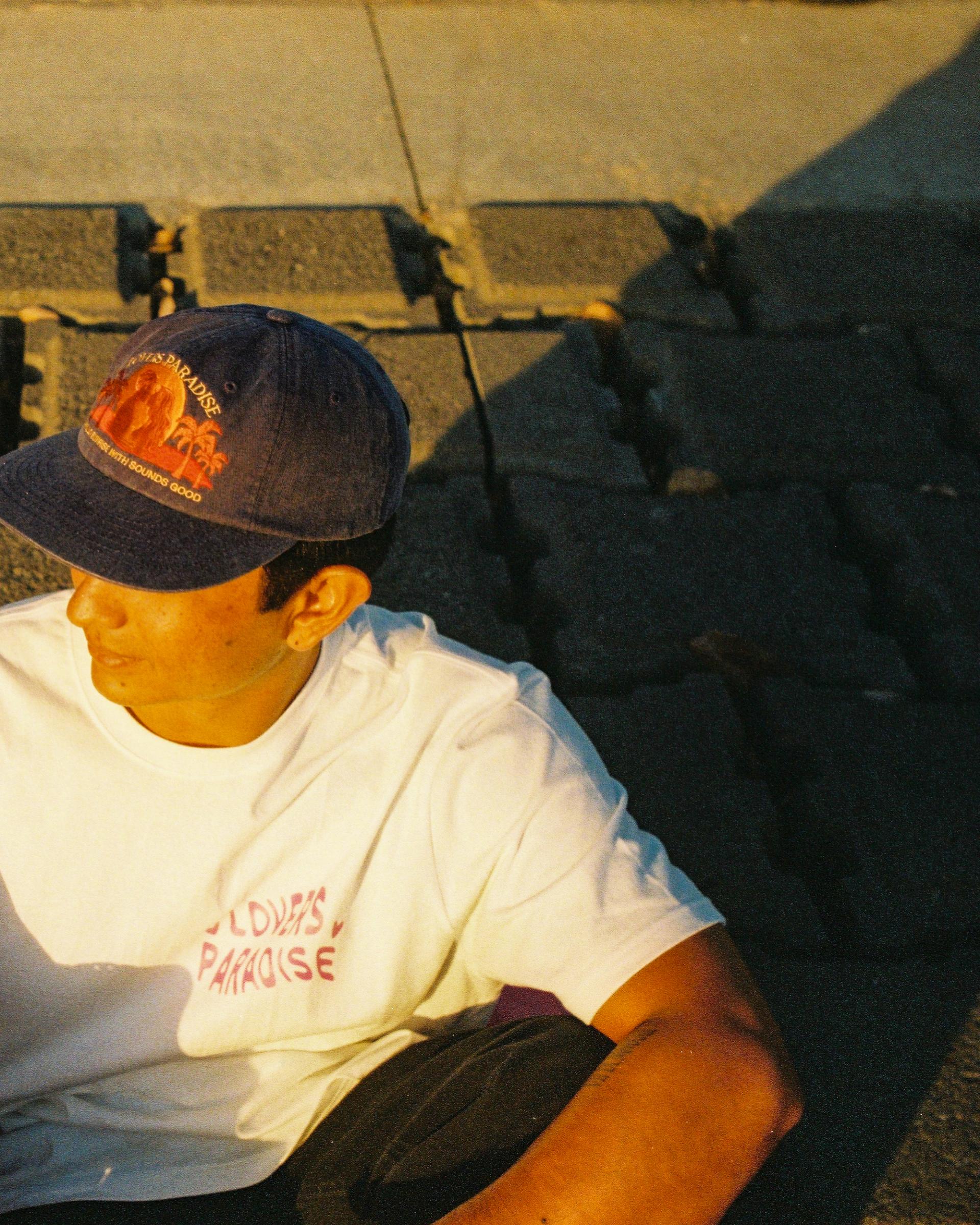 SOUNDS GOOD 과 Hello Sunrise 의 협업 그래픽인 "LOVERS PARADISE"가 자수로 새겨진 6패널 캡.